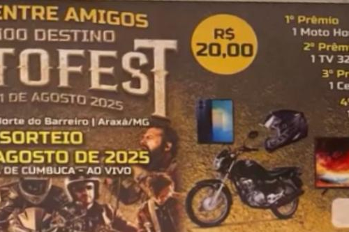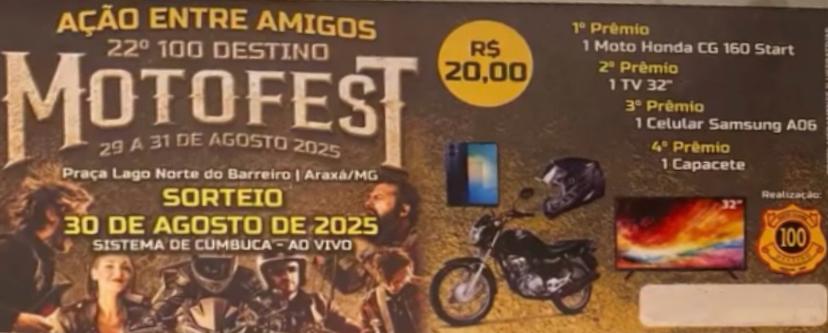 RIFAS-22° 100 DESTINO MOTOFEST-sorteio 30/08, sistema de cumbuca ao vivo: 1º Prêmio- 1 Moto Honda CG 160 Start/ 2° Prêmio- 1 TV 32 / 3° Prêmio- 1 Celular Samsung A06 / 4° Prêmio- 1 Capacete